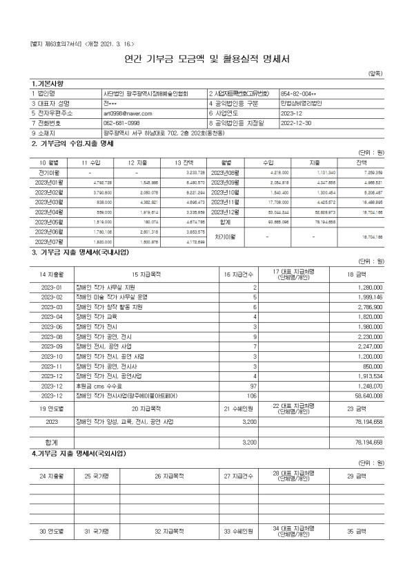 2023년 연간 기부금 모금 및 활용 실적 명세서 페이지 정보 작성자최고관리자 조회 6회 작성일 2025-10-24 16:12:41 댓글 0 list_alt목록 본문 2023년 연간 기부금 모금 및 활용 실적 명세서 첨부파일 2023년 연간기부금모금액 및 활용실적 명세서 2.hwp (50.0K) 0회 다운로드 | DATE : 2025-10-24 16:56:04 이전글 2022년 연간 기부금 모금 및 활용 실적 명세서 다음글2024년 연간 기부금 모금 및 활용실적 명세서 arrow_back arrow_forward list_alt 댓글 0 등록된 댓글이 없습니다.