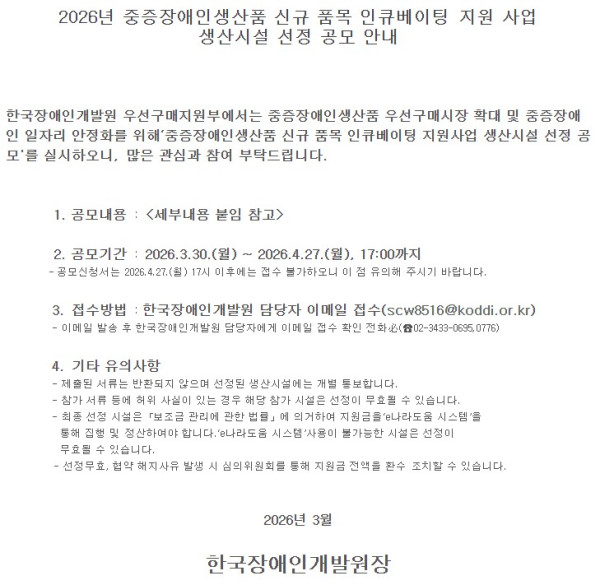 [한국장애인개발원] 2026년 중증장애인생산품 신규 품목 인큐베이팅 지원사업 생산시설 선정 공모 안내