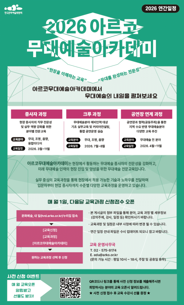 [한국문화예술위원회] 2026 아르코무대예술아카데미 연간일정 페이지 정보 작성자최고관리자 조회 57회 작성일 2026-02-04 10:53:03 댓글 0 list_alt목록 본문 2026 아르코무대예술아카데미 연간일정 관련링크 https://www.arko.or.kr/board/view/4053?bid=&page=&cid=1810327 26회 연결 https://docs.google.com/forms/d/e/1FAIpQLScXlvn0eH4q1A1V_XVVo0wY2CyVFo… 26회 연결 이전글 3월 상설미디어교육 안내 다음글2026년 제5회 에이프캠프(APE CAMP) 국내 참여자 오픈콜 arrow_back arrow_forward list_alt 댓글 0 등록된 댓글이 없습니다.