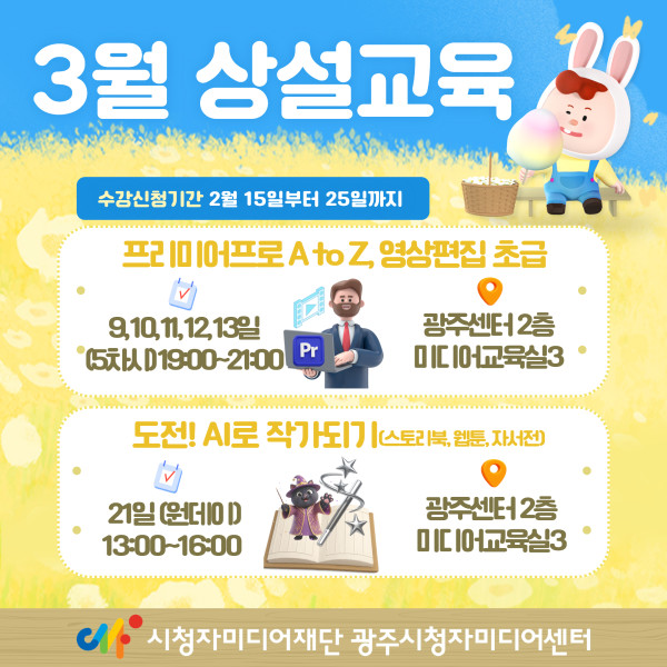 [광주시청미디어센터] 3월 상설미디어교육 안내 페이지 정보 작성자최고관리자 조회 40회 작성일 2026-02-06 10:36:30 댓글 0 list_alt목록 본문 3월 상설미디어교육 프로그램 안내 관련링크 https://kcmf.or.kr/KCMF/contents/KCMF050307.do?schM=view&page=1&viewCo… 17회 연결 이전글 2026 국립현대미술관 미술은행 작품구입 공모 다음글2026 아르코무대예술아카데미 연간일정 arrow_back arrow_forward list_alt 댓글 0 등록된 댓글이 없습니다.