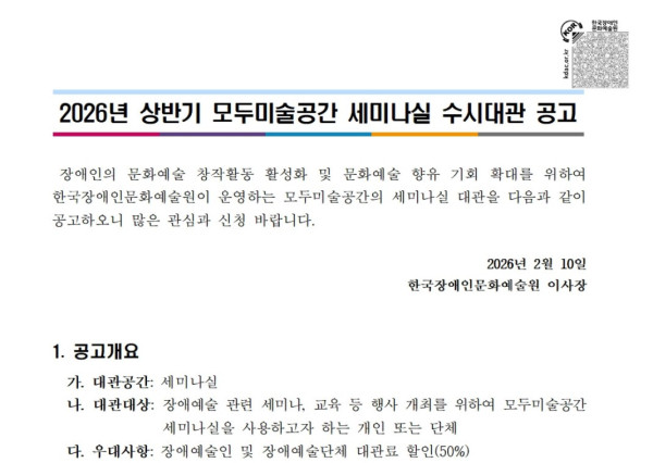 [한국장애인문화예술원] 2026년 상반기 모두미술공간 세미나실 수시대관 공고