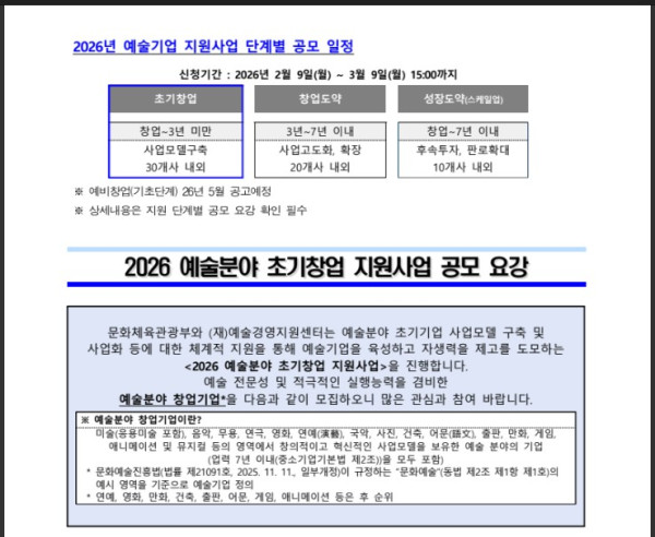 [문화체육관광부] 예술경영지원센터 2026 예술분야 초기창업 지원사업 공모