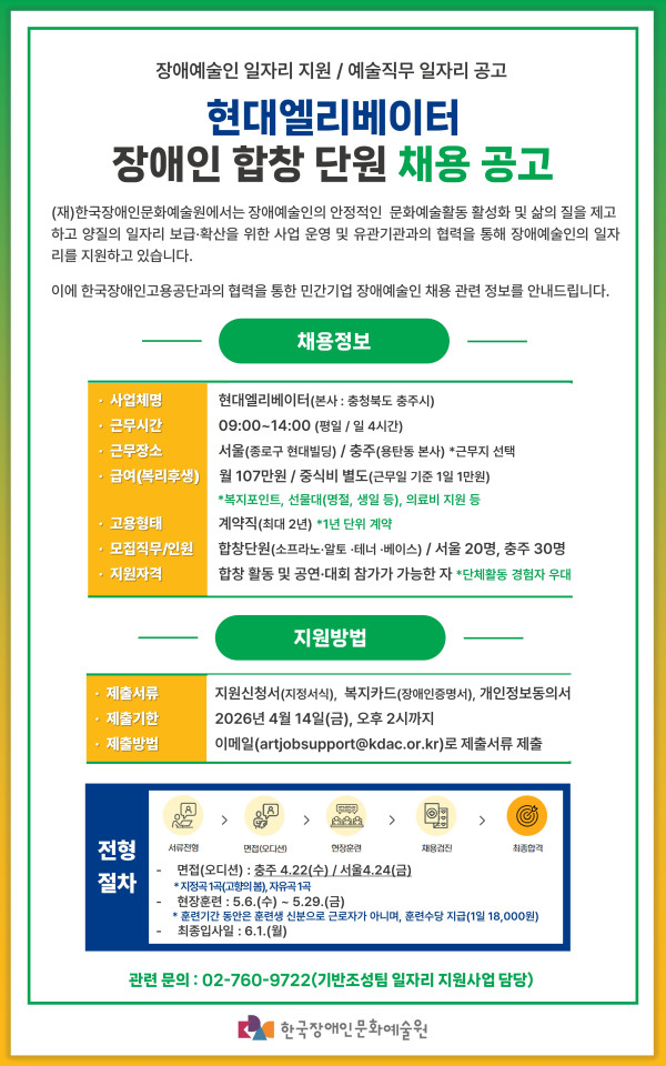 [한국장애인문화예술원] (일자리지원) 현대엘리베이터 장애인합창단원 채용 공고(~4.14.(화), 14시까지)
