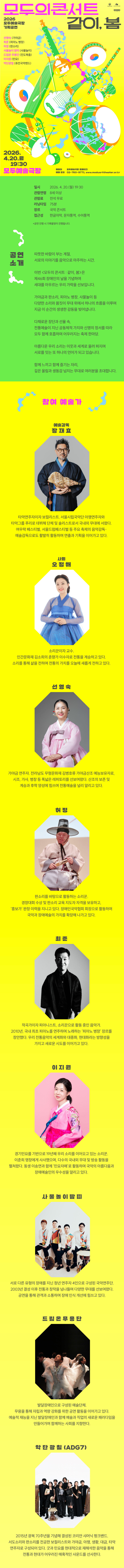 [한국장애인문화예술원] 2026 모두예술극장 <모두의 콘서트 : 같이, 봄> 공연 개최 안내 (4.20) 페이지 정보 작성자최고관리자 조회 3회 작성일 2026-04-08 10:00:20 댓글 0 list_alt목록 본문 2026 모두예술극장 <모두의 콘서트 : 같이, 봄> 공연 개최 안내 (4.20) 관련링크 https://kdac.or.kr/board/read?boardManagementNo=1&boardNo=4258&searchC… 2회 연결 https://www.moduarttheater.or.kr/product/ko/performance/253001 2회 연결 이전글 2026모두미술공간 <관계의 기술 : 기꺼이 기어이 기대어> 개최 안내(4.16~5.23) 다음글(일자리지원) 현대엘리베이터 장애인합창단원 채용 공고(~4.14.(화), 14시까지) arrow_back arrow_forward list_alt 댓글 0 등록된 댓글이 없습니다.