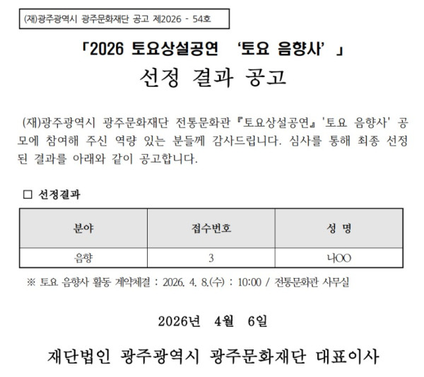 [광주문화재단] 2026 토요상설공연 '토요 음향사' 모집 페이지 정보 작성자최고관리자 조회 3회 작성일 2026-04-08 10:15:11 댓글 0 list_alt목록 본문 2026 토요상설공연 '토요 음향사' 모집 첨부파일 2026 토요상설공연 토요 음향사 공모 결과.pdf (59.9K) 0회 다운로드 | DATE : 2026-04-08 10:15:11 관련링크 https://www.gjcf.or.kr/cf/Board/86803/detailView.do 2회 연결 이전글 2026 광주국제아트페어(아트광주) 참가 갤러리 모집 공고 다음글2026 지역서점 활성화 지원사업“책으로(路)” 운영서점 모집 arrow_back arrow_forward list_alt 댓글 0 등록된 댓글이 없습니다.