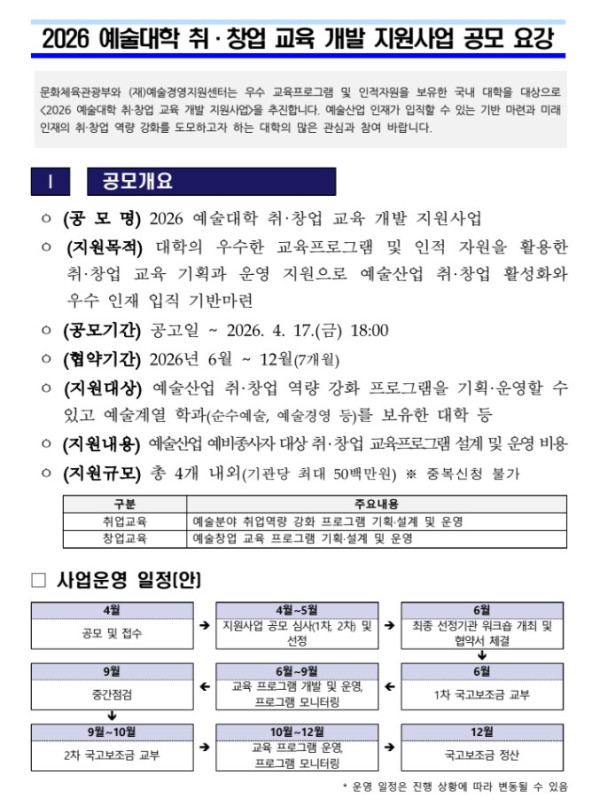 [예술경영지원센터] 2026 예술대학 취·창업 교육 개발 지원사업 공모(~4.17.(금) 18:00)