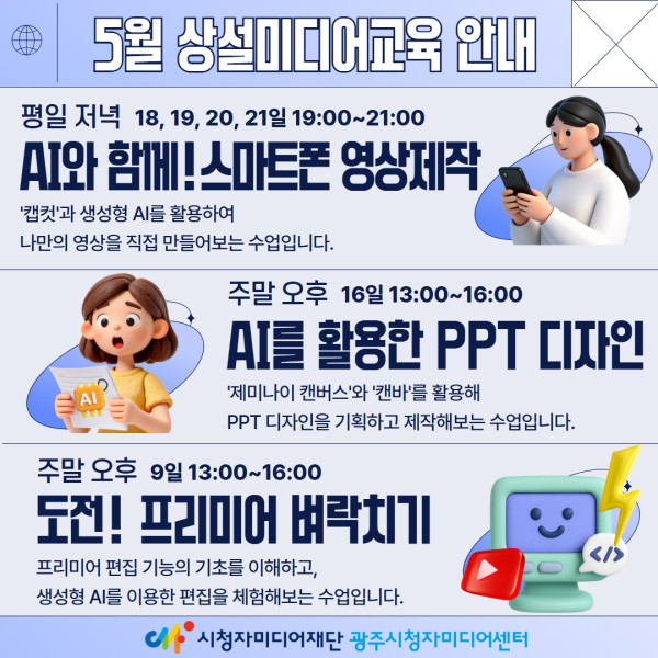 [광주시청미디어센터] 5월 상설미디어교육 안내(시니어 포함) 페이지 정보 작성자최고관리자 조회 4회 작성일 2026-04-08 14:33:20 댓글 0 list_alt목록 본문 5월 상설미디어교육 안내(시니어 포함) 관련링크 https://kcmf.or.kr/KCMF/contents/KCMF050307.do?schM=view&page=1&viewCo… 6회 연결 이전글 『2026 기획창작스튜디오 레벨업 프로젝트 제작지원』모집공고 다음글[보도자료] 장애인기업종합지원센터, 창업 임차보증금 최대 1억3천만 원 지원 arrow_back arrow_forward list_alt 댓글 0 등록된 댓글이 없습니다.