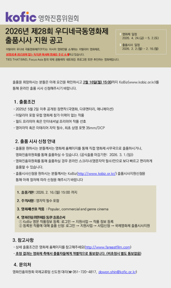 [영화진흥위원회] 2026년 제28회 우디네 극동영화제 출품시사 지원 공고 [~2.17.(월) 15시]