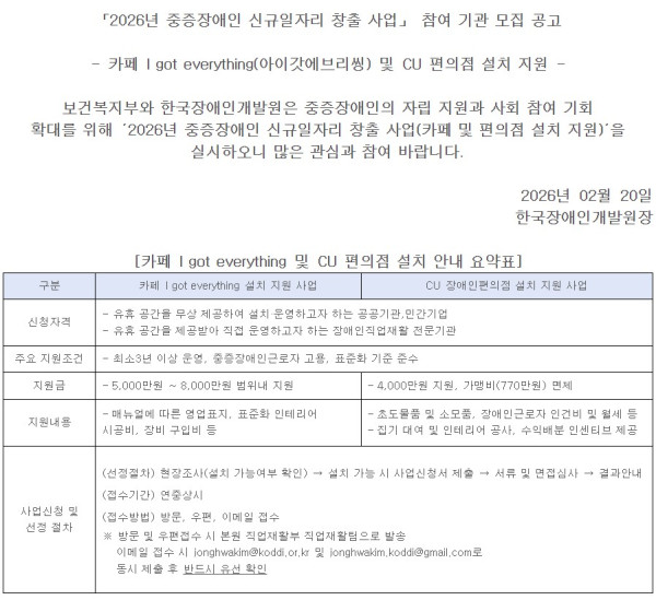 2026년 중증장애인 신규일자리 창출사업(카페 및 편의점 설치 지원) 참여기관 모집 공고
