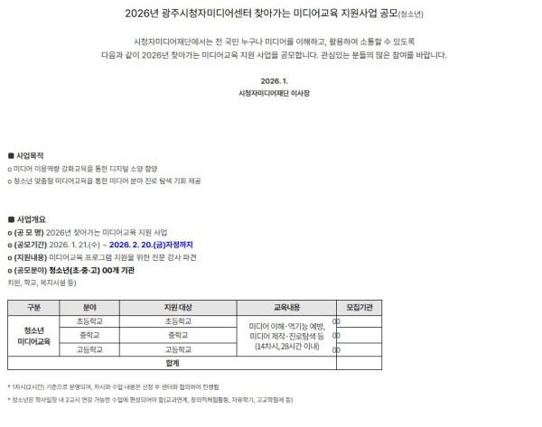 [광주시청미디어센터] 2026 찾아가는 미디어교육 지원사업(청소년) 공모 (~2026. 2. 20.(금) 까지)