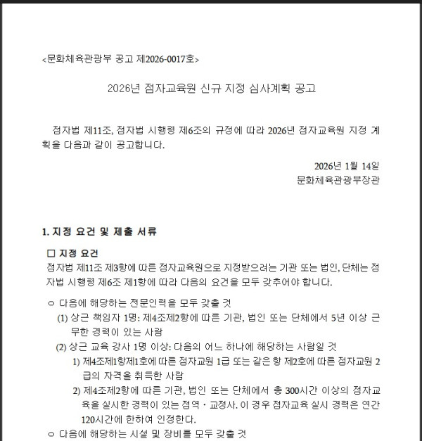 [문화체육관광부] 2026년 점자교육원 신규 지정 심사계획 공고 페이지 정보 작성자최고관리자 조회 96회 작성일 2026-01-15 10:58:52 댓글 0 list_alt목록 본문 2026년 점자교육원 신규 지정 심사계획 공고 첨부파일 2026년 점자교육원 신규 지정 심사 계획 공고문.hwp (118.5K) 0회 다운로드 | DATE : 2026-01-15 10:58:52 관련링크 https://www.mcst.go.kr/site/s_notice/notice/noticeView.jsp?pSeq=19042 34회 연결 이전글 한국장애인고용공단, 「2026년 사업설명회」 참여자 사전 접수 다음글2026 아트코리아랩 비즈센터 아트부스트 <예술기업의 정부지원사업 활용 및 지원전략> 참여자 모집 arrow_back arrow_forward list_alt 댓글 0 등록된 댓글이 없습니다.