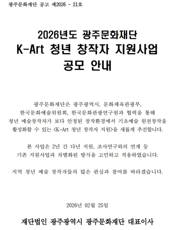- 2026년 광주문화재단 「K-Art 청년창작자지원사업」 공모안.pdf (159.8K) 0회 다운로드 | DATE : 2026-02-26 09:14:26