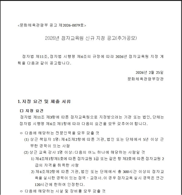 [문화체육관광부] 2026년 점자교육원 지정 계획 공고문(추가공모) 페이지 정보 작성자최고관리자 조회 2회 작성일 2026-02-26 09:21:20 댓글 0 list_alt목록 본문 2026년 점자교육원 지정 계획 공고문(추가공모) 첨부파일 2026년 점자교육원 지정 계획 공고문추가공모.hwp (119.5K) 0회 다운로드 | DATE : 2026-02-26 09:21:20 관련링크 https://www.mcst.go.kr/site/s_notice/notice/noticeView.jsp?pSeq=19129 1회 연결 이전글 2026년 지역사회서비스투자사업 이용자 추가모집 안내(성인장애인 개인맞춤형 통합형 재활서비스) 다음글2026년 광주문화재단「K-Art 청년창작자지원사업」공모 안내 arrow_back arrow_forward list_alt 댓글 0 등록된 댓글이 없습니다.