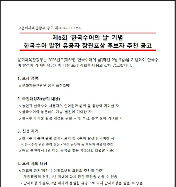- [공고문] 제6회 한국수어의 날 기념 한국수어 발전 유공자 장관포상 후보자 추천 공고.hwp (148.5K) 0회 다운로드 | DATE : 2026-01-06 15:15:12