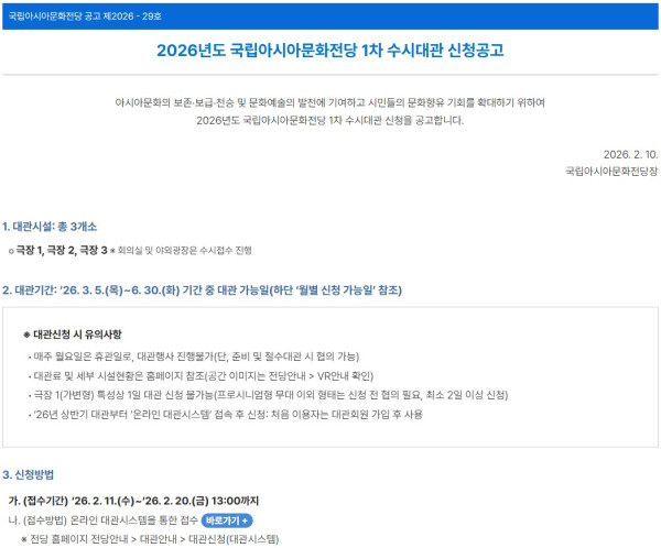 [아시아문화전당] 2026년도 국립아시아문화전당 1차 수시대관 신청공고 페이지 정보 작성자최고관리자 조회 22회 작성일 2026-02-11 10:17:15 댓글 0 list_alt목록 본문 2026년도 국립아시아문화전당 1차 수시대관 신청공고 첨부파일 2026년도문화전당1차수시대관신청공고.hwp (40.5K) 0회 다운로드 | DATE : 2026-02-11 10:17:15 관련링크 https://www.acc.go.kr/main/board/board.do?PID=0701&boardID=NOTICE&acti… 11회 연결 이전글 한국장애인고용공단-(사)대한병원행정관리자협회 의료기관 장애인 고용 확대를 위한 업무협약 체결 다음글2026 도심속 문화예술축제 "도시 락(樂)" 공연팀 모집 안내 arrow_back arrow_forward list_alt 댓글 0 등록된 댓글이 없습니다.