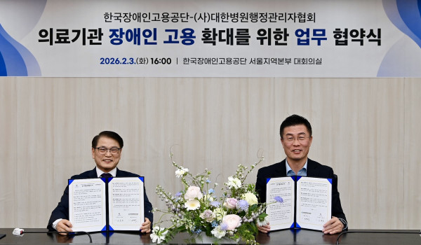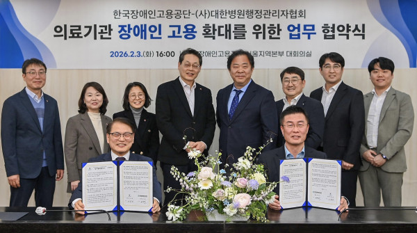 한국장애인고용공단(이사장 이종성)과 (사)대한병원행정관리자협회(회장 권영식)은 2월 3일(화) 한국장애인고용공단 서울지역본부에서 의료기관 내 장애인 고용 확대와 사회적 책임 실천을 위한 ‘장애인 고용 증진 업무협약’을 체결했다.