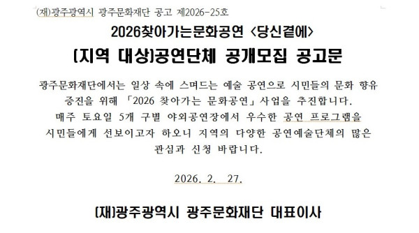 [광주문화재단] 2026 찾아가는문화공연 공연단체 공모(지역 대상)