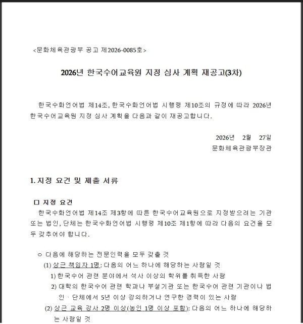 [문화체육관광부] 2026년 한국수어교육원 지정 심사 계획 재공고(3차) 페이지 정보 작성자최고관리자 조회 51회 작성일 2026-03-03 09:32:03 댓글 0 list_alt목록 본문 2026년 한국수어교육원 지정 심사 계획 재공고(3차) 첨부파일 2026년 한국수어교육원 지정 심사 계획 재공고문3차.hwp (110.5K) 1회 다운로드 | DATE : 2026-03-03 09:32:03 관련링크 https://www.mcst.go.kr/site/s_notice/notice/noticeView.jsp?pSeq=19138&… 46회 연결 이전글 서구, 맞춤형 장애인일자리로 사회참여 확대 다음글2026 찾아가는문화공연 공연단체 공모(지역 대상) arrow_back arrow_forward list_alt 댓글 0 등록된 댓글이 없습니다.