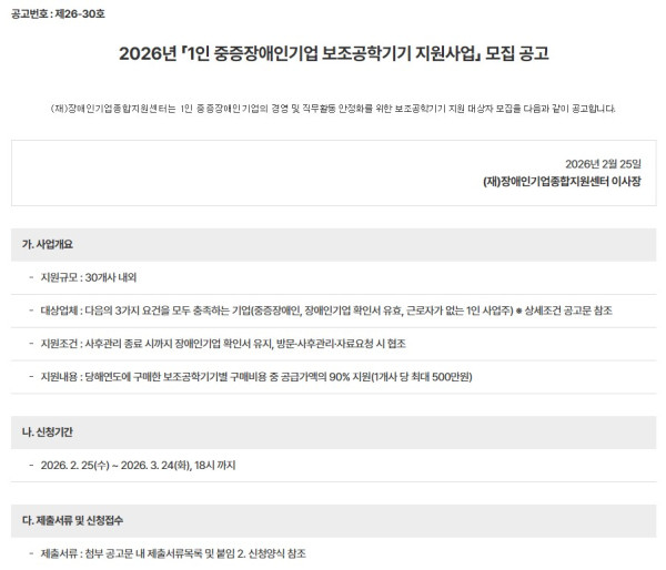 [장애인기업종합지원센터] 1인 사업자 보조공학기기 지원 | 2026년 「1인 중증장애인기업 보조공학기기 지원사업」 모집 공고