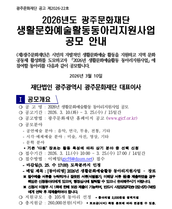 - 2026년 생활문화예술활동동아리지원사업 공고문.hwp (90.0K) 0회 다운로드 | DATE : 2026-03-17 09:19:48