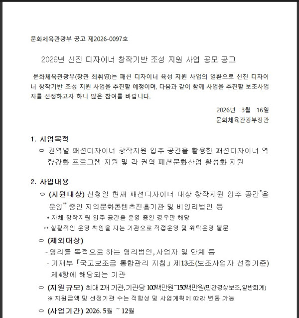 [문화체육관광부] 2026년 신진 디자이너 창작기반 조성 지원 사업 공모 공고
