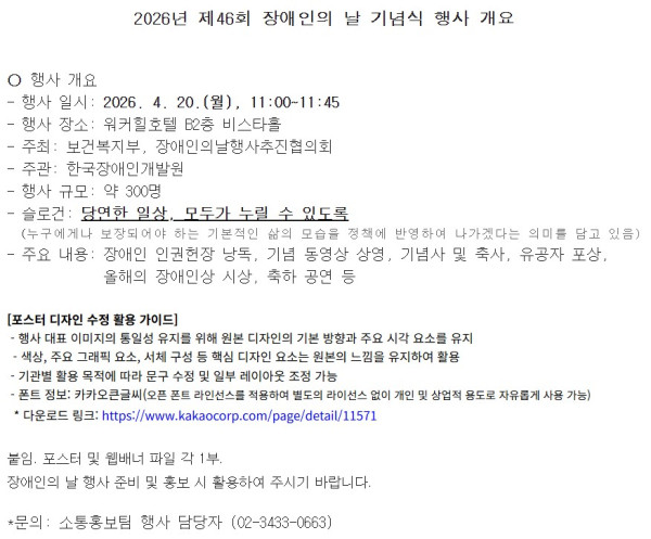 [한국장애인개발원] 2026년 제46회 장애인의 날 기념식 및 포스터 안내 페이지 정보 작성자최고관리자 조회 7회 작성일 2026-03-26 10:42:23 댓글 0 list_alt목록 본문 2026년 제46회 장애인의 날 기념식 및 포스터 안내 첨부파일 제46회 장애인의날 포스터.배너_게시용.zip (10.2M) 0회 다운로드 | DATE : 2026-03-26 10:42:23 관련링크 https://www.koddi.or.kr/bbs/notice01_view.jsp?brdNum=7428637&brdTp=&se… 4회 연결 이전글 2026년 중증장애인생산품 신규 품목 인큐베이팅 지원사업 생산시설 선정 공모 안내 다음글[한국장애인고용공단 광주지역본부] 체험형 청년인턴(기간제근로자) 채용 재공고 arrow_back arrow_forward list_alt 댓글 0 등록된 댓글이 없습니다.